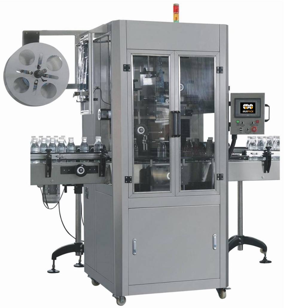 - Los envases procedentes de la línea de envasado pasan al transportador de entrada del aplicador de sleeve en fila de uno