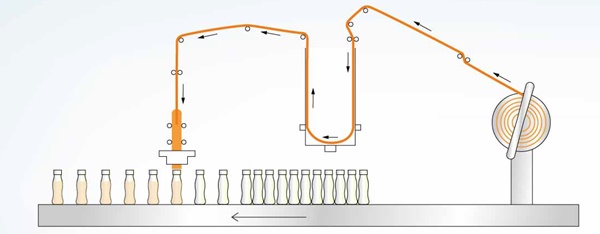 - Al llegar a esta zona el aplicador detecta el envase y realiza el corte del film a la medida indicada, y la introduccion de este por el exterior del envase
